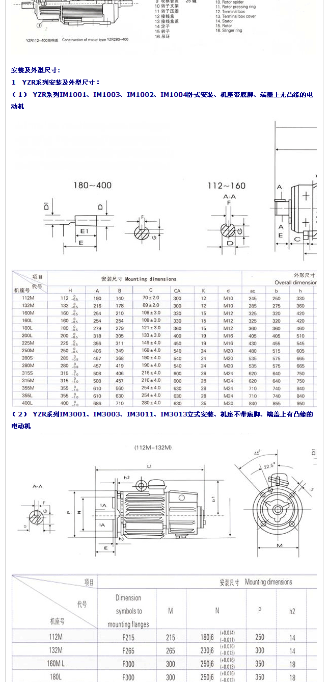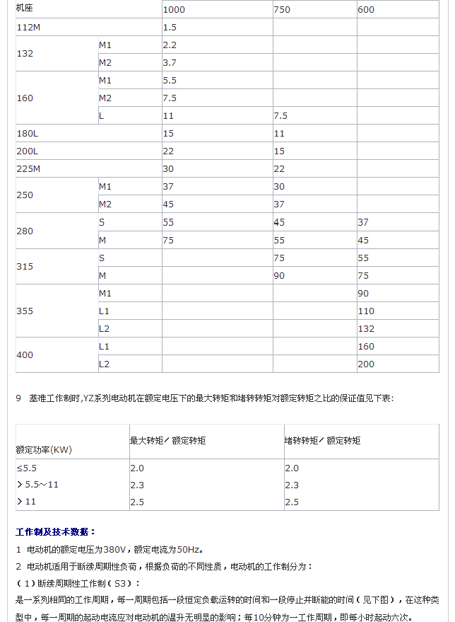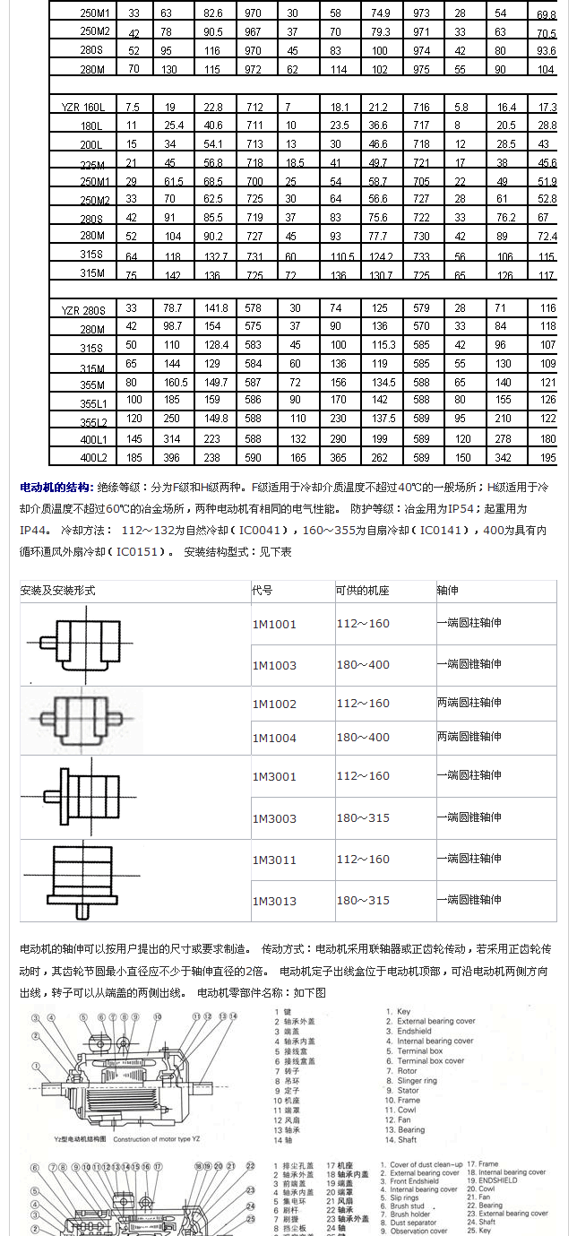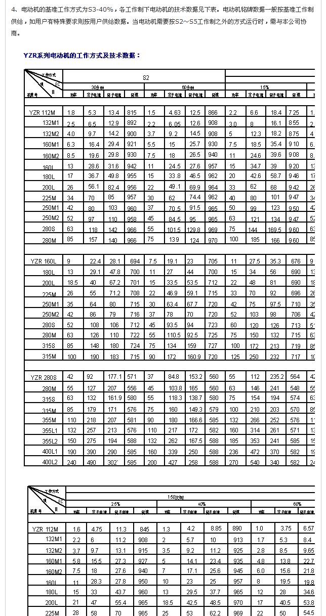 YZR、YZ系列冶金及起重用绕线子与鼠笼转子三相异步电动机系用于各种类型的起重机械及其他类似设备的电力驱动,具有较高的过载能力和机械强度,适用于短时或断续周期工作制,频繁启动、制动、及有显著的振动与冲击的设备。电动机的功率等级和安装尺寸符合IEC72推荐标准,功率等级与安装尺寸的相互关系于日本JEM1202及德国DIN42681相似,大多数可互换,电动机在海拔不超过1000米能够保证正常运行。电动机的绝缘等级分为F级和H级两种,F级适用于环境空气温度不超过40℃的一般场所;H级适用于环境空气温度不超过60℃的冶金场所,两种电动机具有相同的参数。电动机具有良好的密封性,用于一般场所的电动机防护等级为IP4,用于冶金场所的电动机防护等级为IP54。YZR冶金起重电机为冶金及起重用绕线转子三相异步电动机产品,符合专业标准JB/T10105-1999规定,YZ系列为冶金及起重用鼠笼转子三相异步电动机产品,符合JB/T10104-1999规定